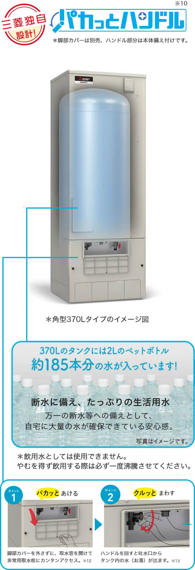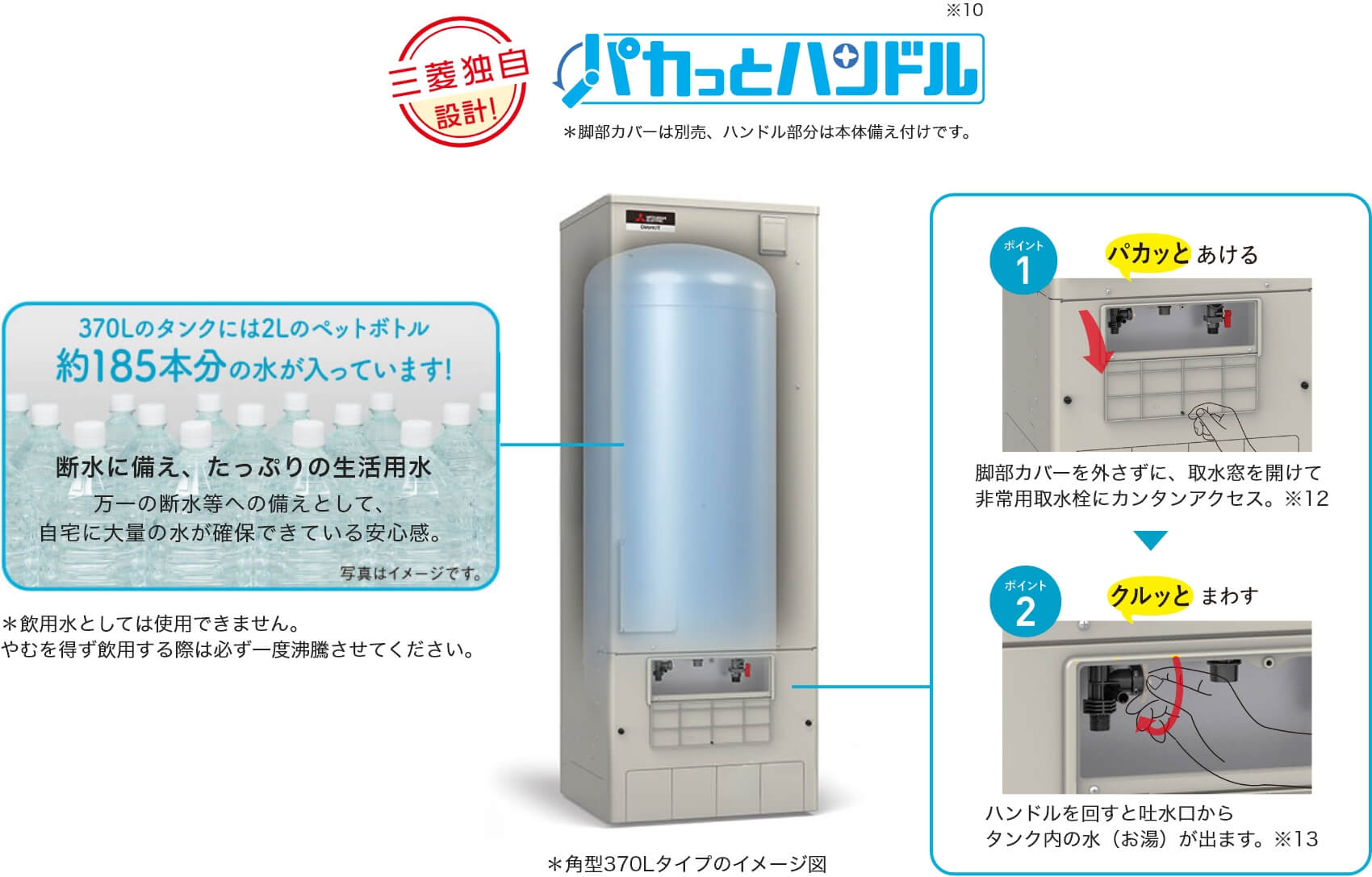- 停電時はお湯を新たに沸かすことはできませんが、貯湯タンクにあるお湯はそのまま使えます。災害時の非常用生活用水としても利用可能です。