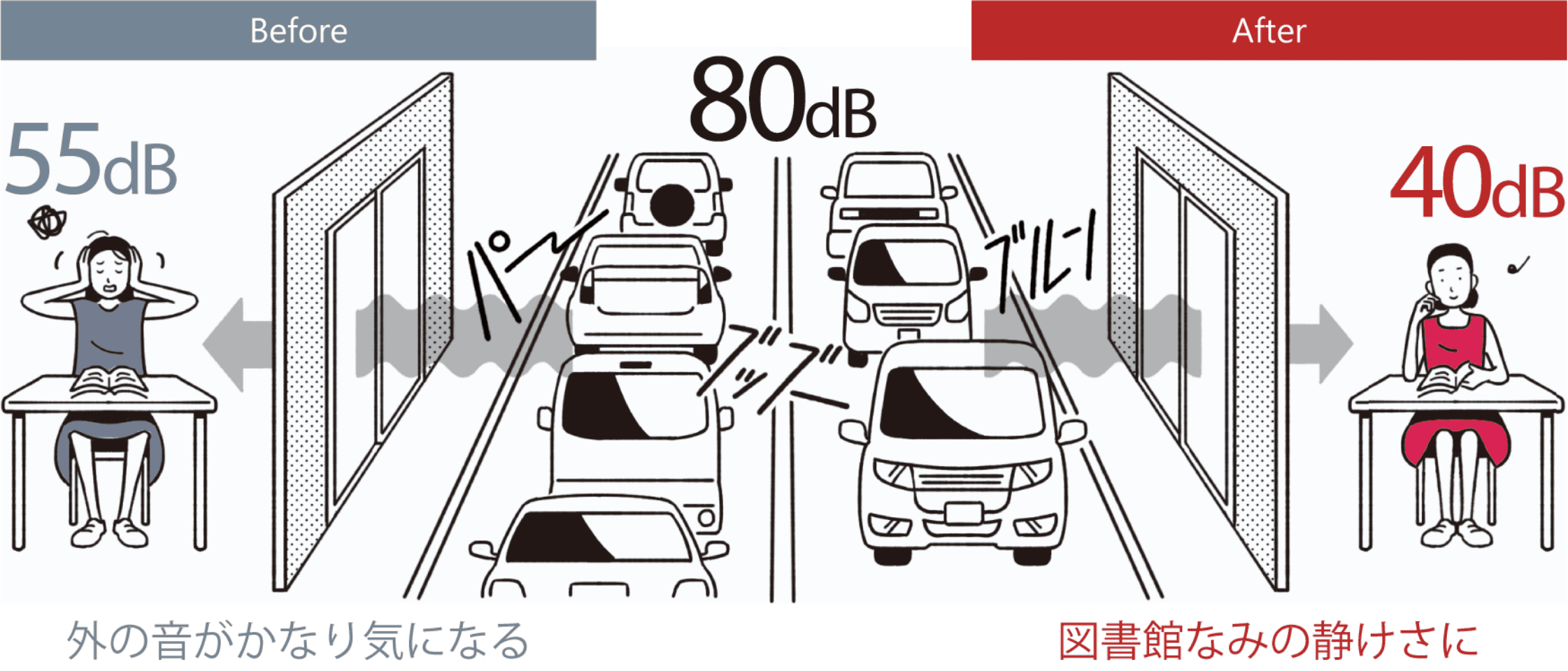 騒音が半分以下に聞こえる※遮音効果です。 ※人間の耳は、10dB下がれば、音が約半分に減ったように感じると言われています。