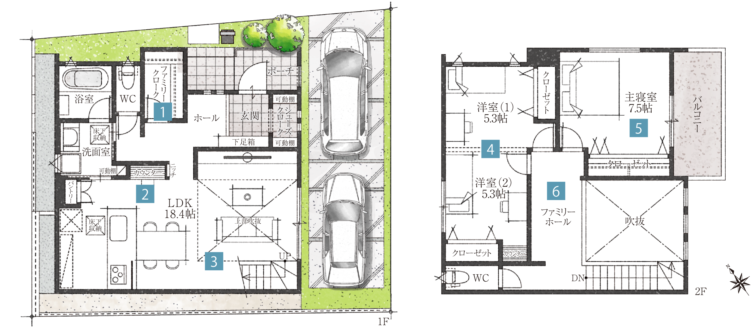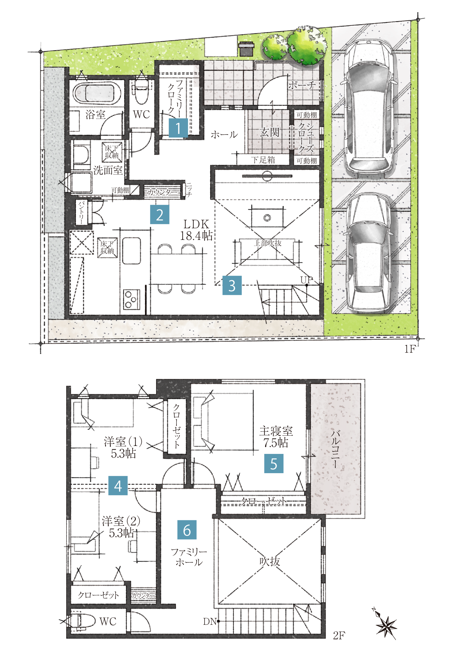 ※掲載の間取り図は設計図を基に描き起こしたもので、実際とは異なります。植栽、車はイメージです。