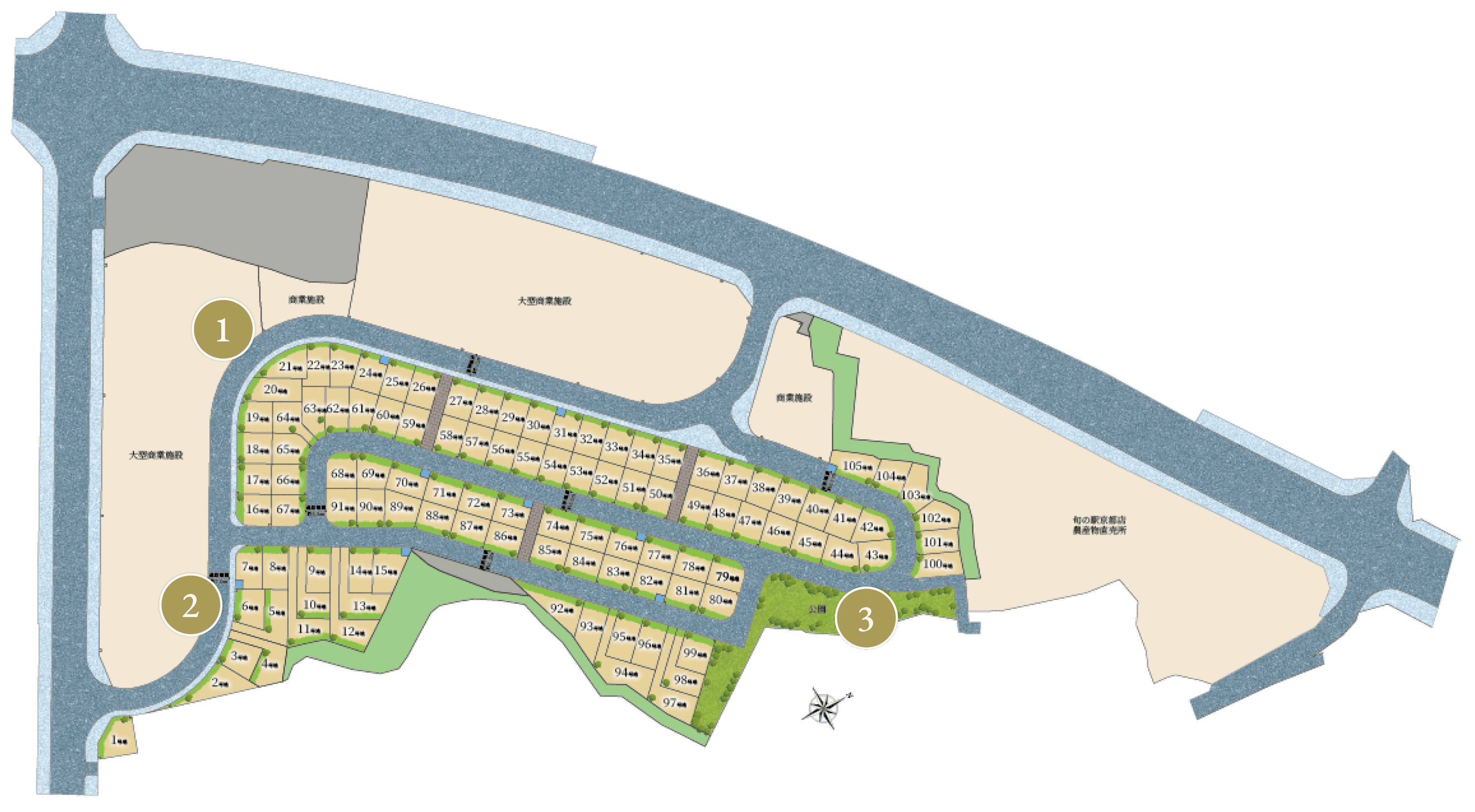 道路の弧を描くラインは美観価値を高めるのはもちろん、死角を少なくすることで街区内の安全性も向上させます。