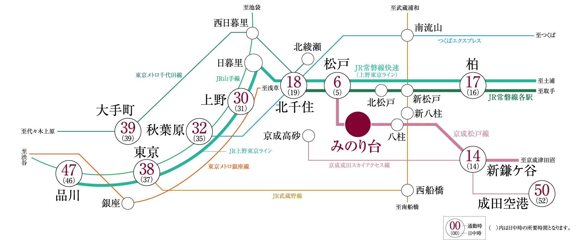 - ※記載の所要時間は、通勤時(7:00~9:00)、日中時(10:00~16:00)に到着駅着としています。