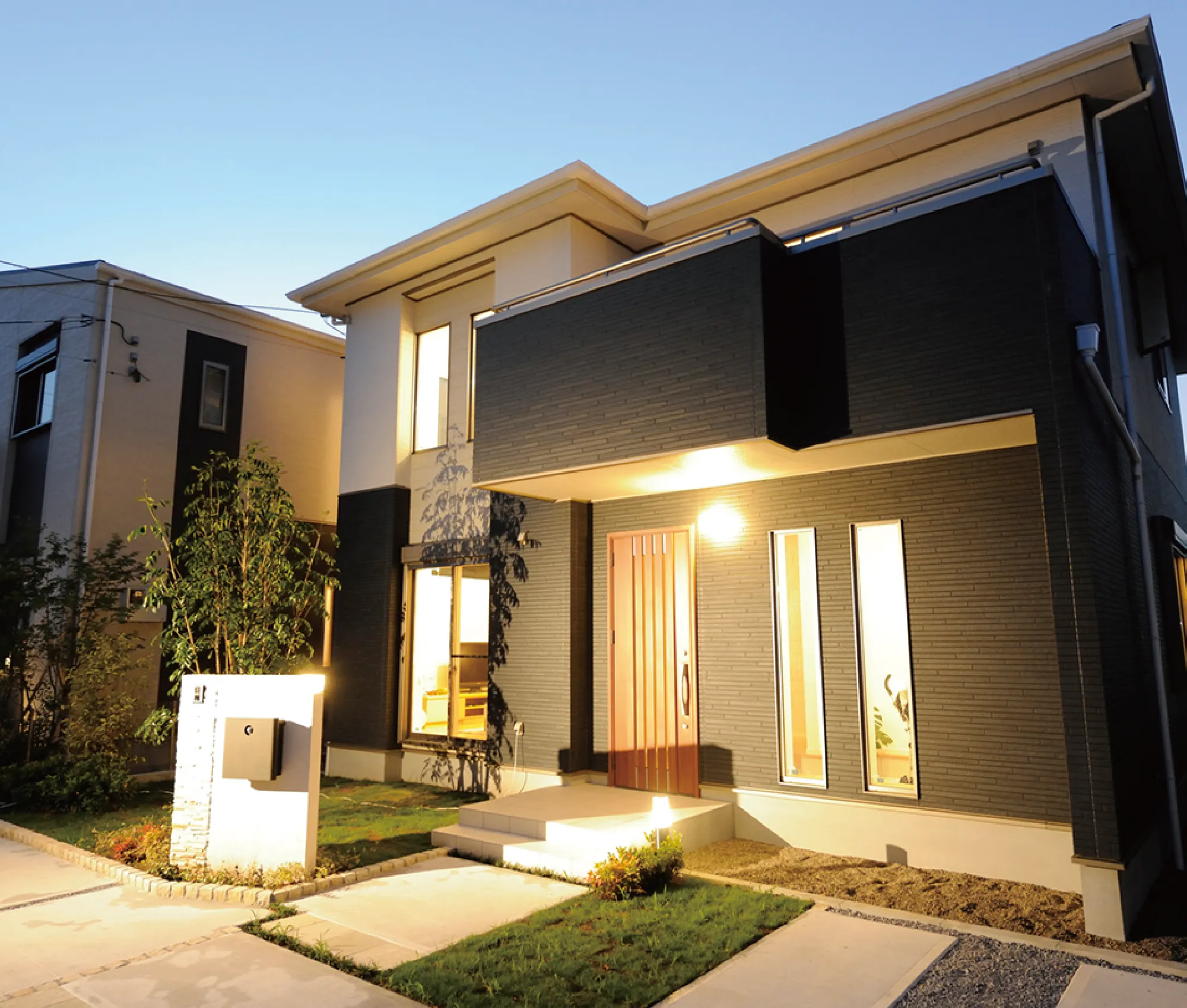 夜の防犯性に配慮 - 自然石を使った門柱や舗装等を採用