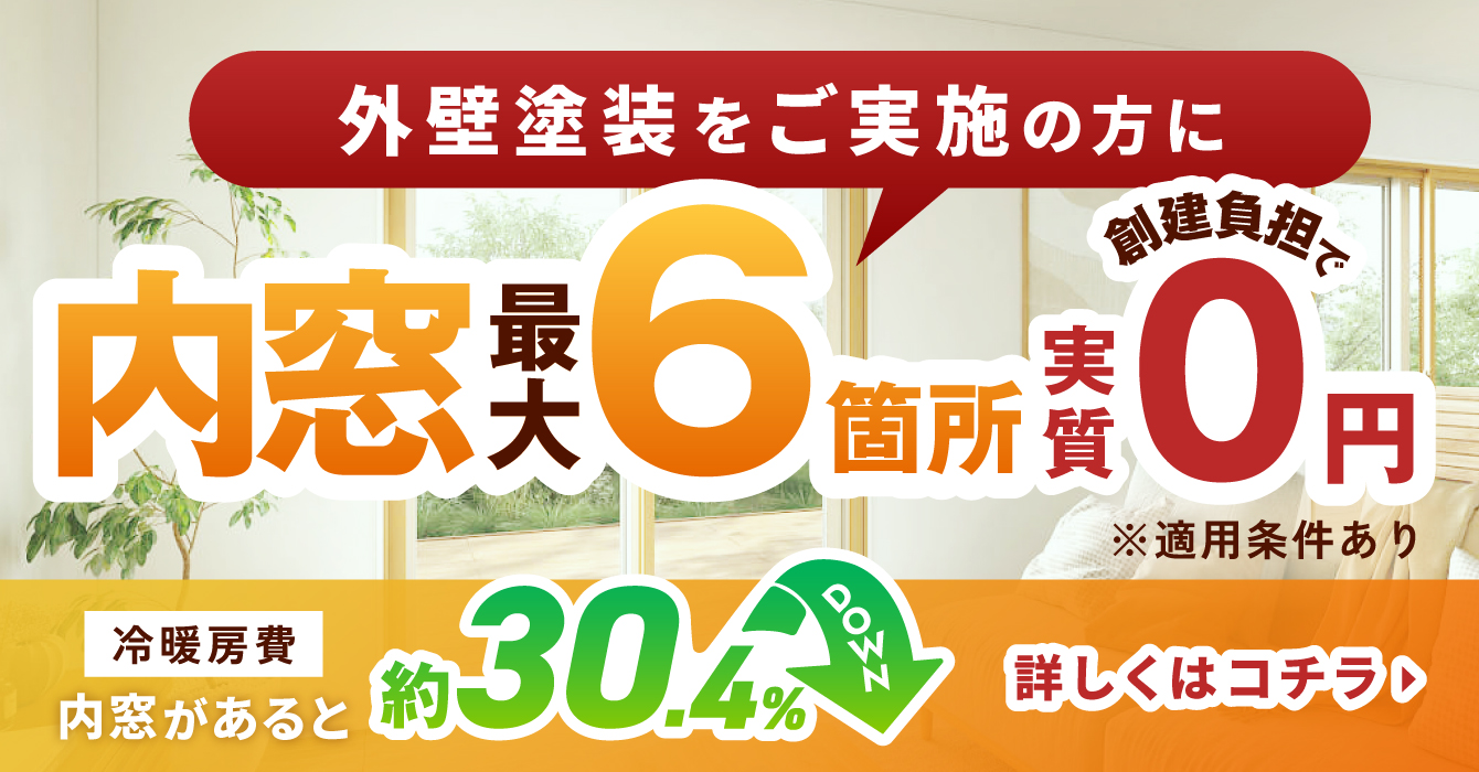- ※1.外壁塗装とセットでの契約が必要です。諸経費40,000円(税込)。小窓(サッシの面積0.2㎡以上1.6㎡未満)、中窓(サッシの面積1.6㎡以上2.8㎡未満)、大窓(サッシの面積2.8㎡以上4.0㎡未満) の中から6箇所選択。大窓は1箇所まで。