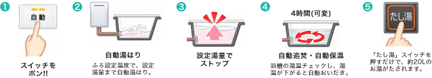 「湯はり」から「おいだき・保温」まですべて自動です。