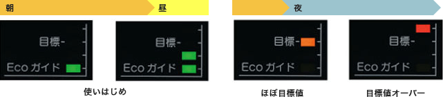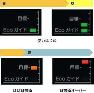 さらに朝から使い始めた使用料の合計が、目標値に対してどのくらいの状況かをLEDライトでガイドしてくれます。 - ECOシグナル機能
